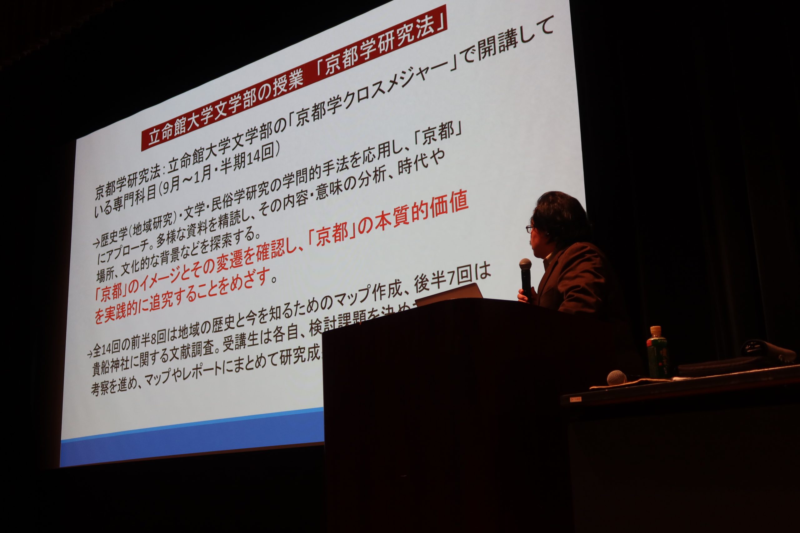 まず田中教授より、「京都学研究法」という授業の概要と、今回受講生が取り組んだ“沿線まち歩きマップ”について説明がありました。