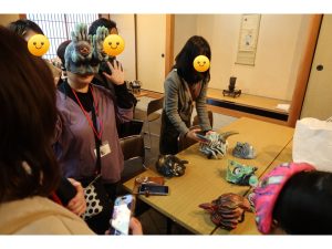 こちらでは、河野先生が製作された妖怪のお面を見せていただく一幕もあり、参加者のみなさまは写真を撮ったりと楽しげなご様子。