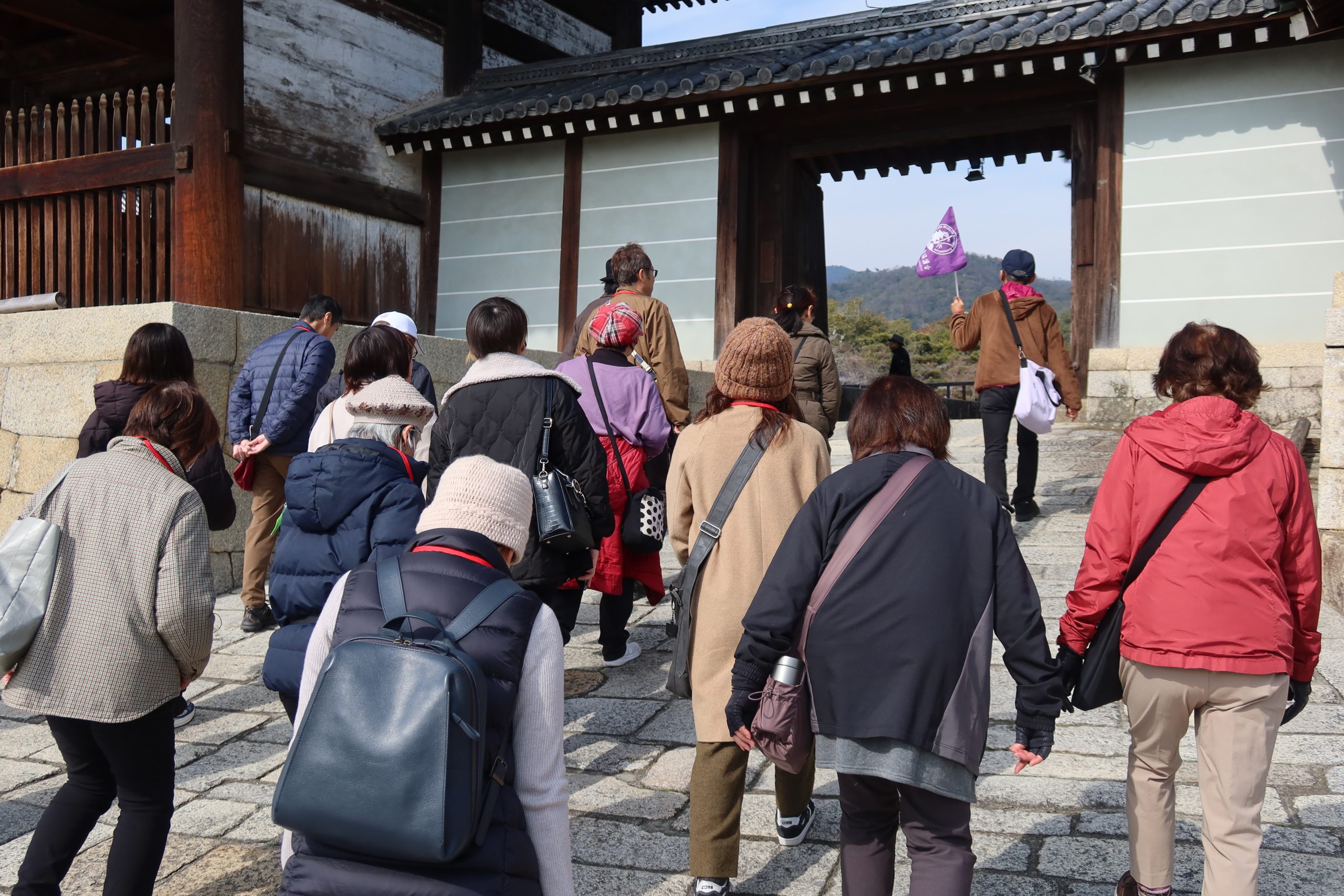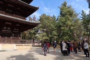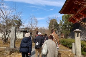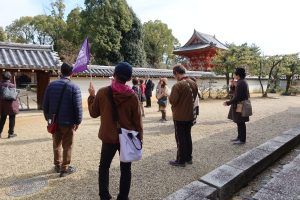 仁和寺では、天狗の伝承や五重の塔と愛宕山の位置関係にまつわるお話、鬼門を守る「桃」のお話や、水掛不動明王のお話など、興味深いエピソードに参加者のみなさまからは思わず「へぇ〜!」という声があがっていました。