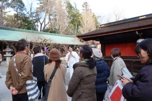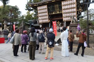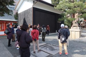 最後は、京都歴史回廊協議会の幹事でもある北野天満宮総務部長・東川様より、北野天満宮の歴史や「御霊信仰」にまつわるお話を伺いました。都の天門とも称される北野天満宮を、神職様のお話を聞きながら散策するたいへん貴重な機会となりました。