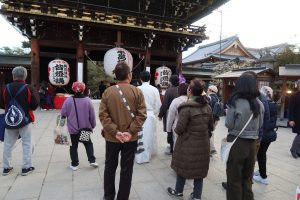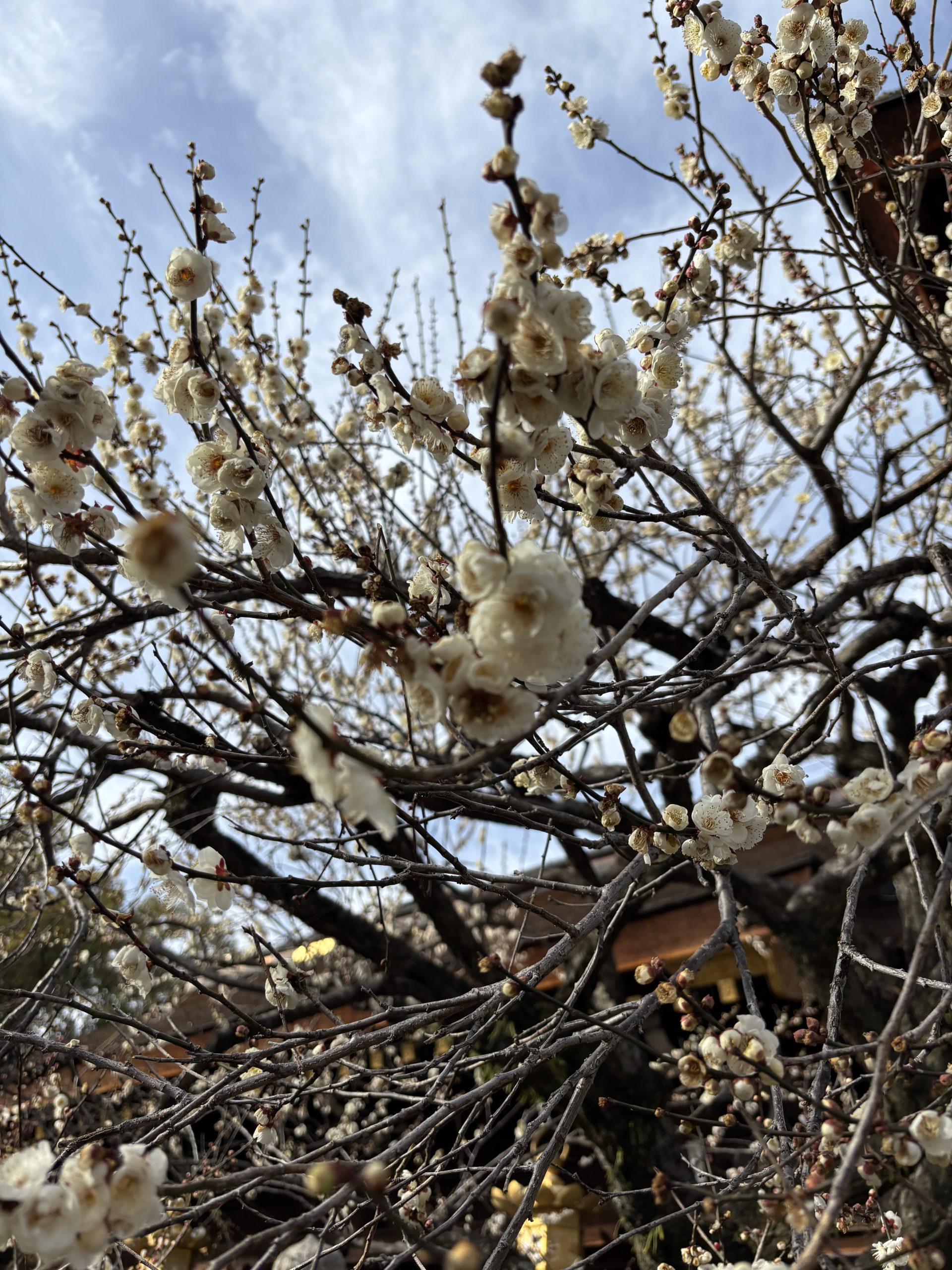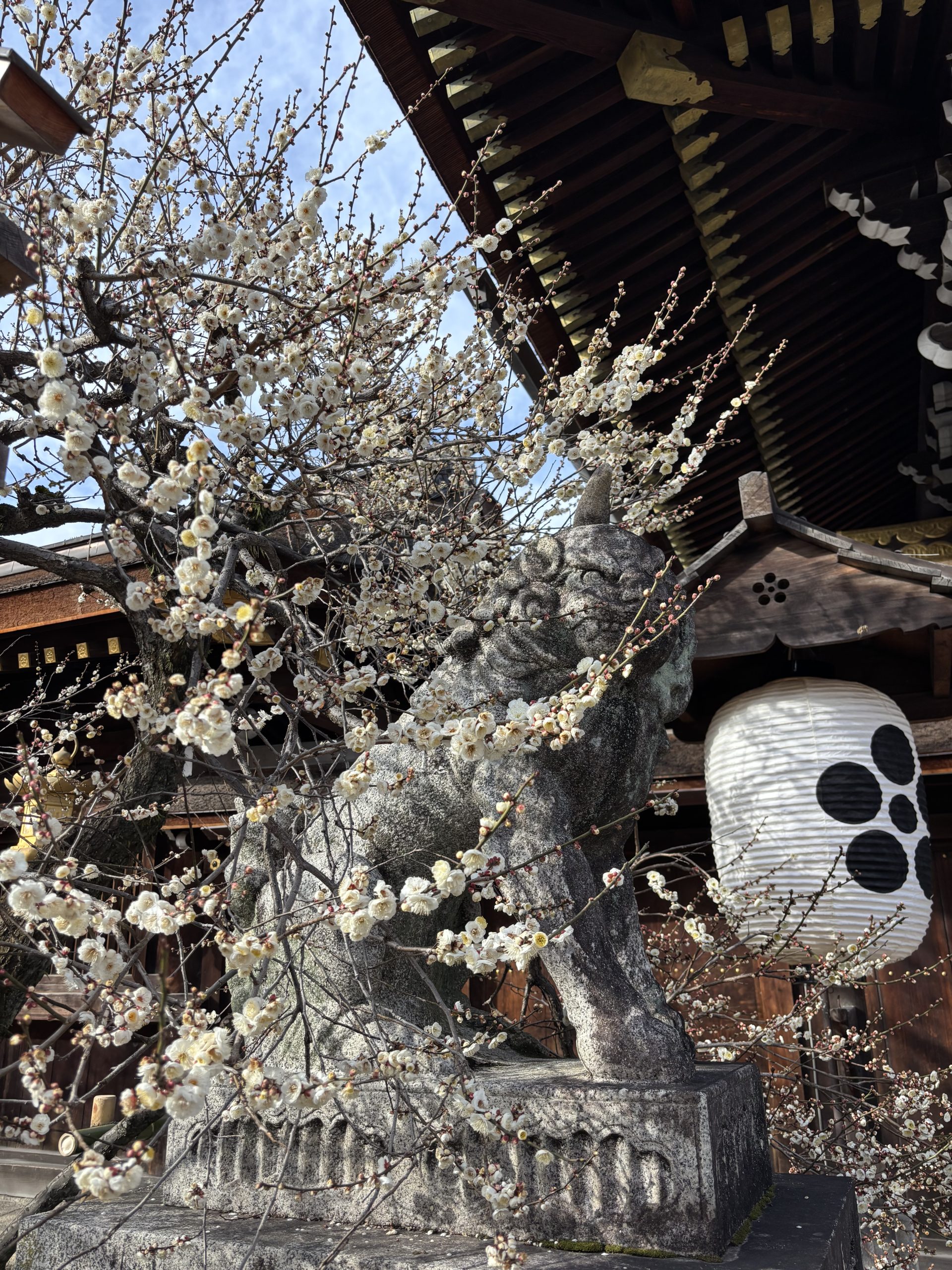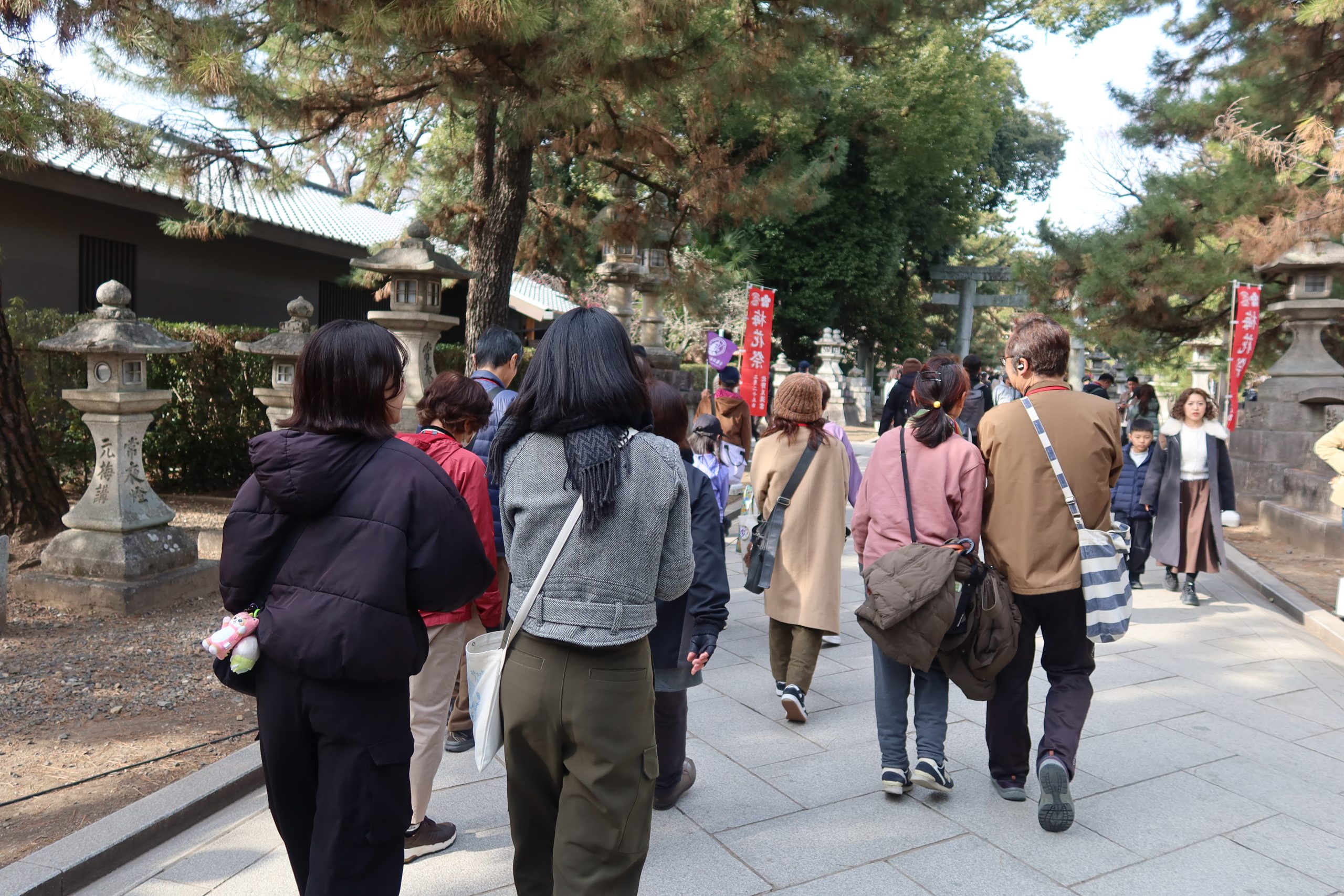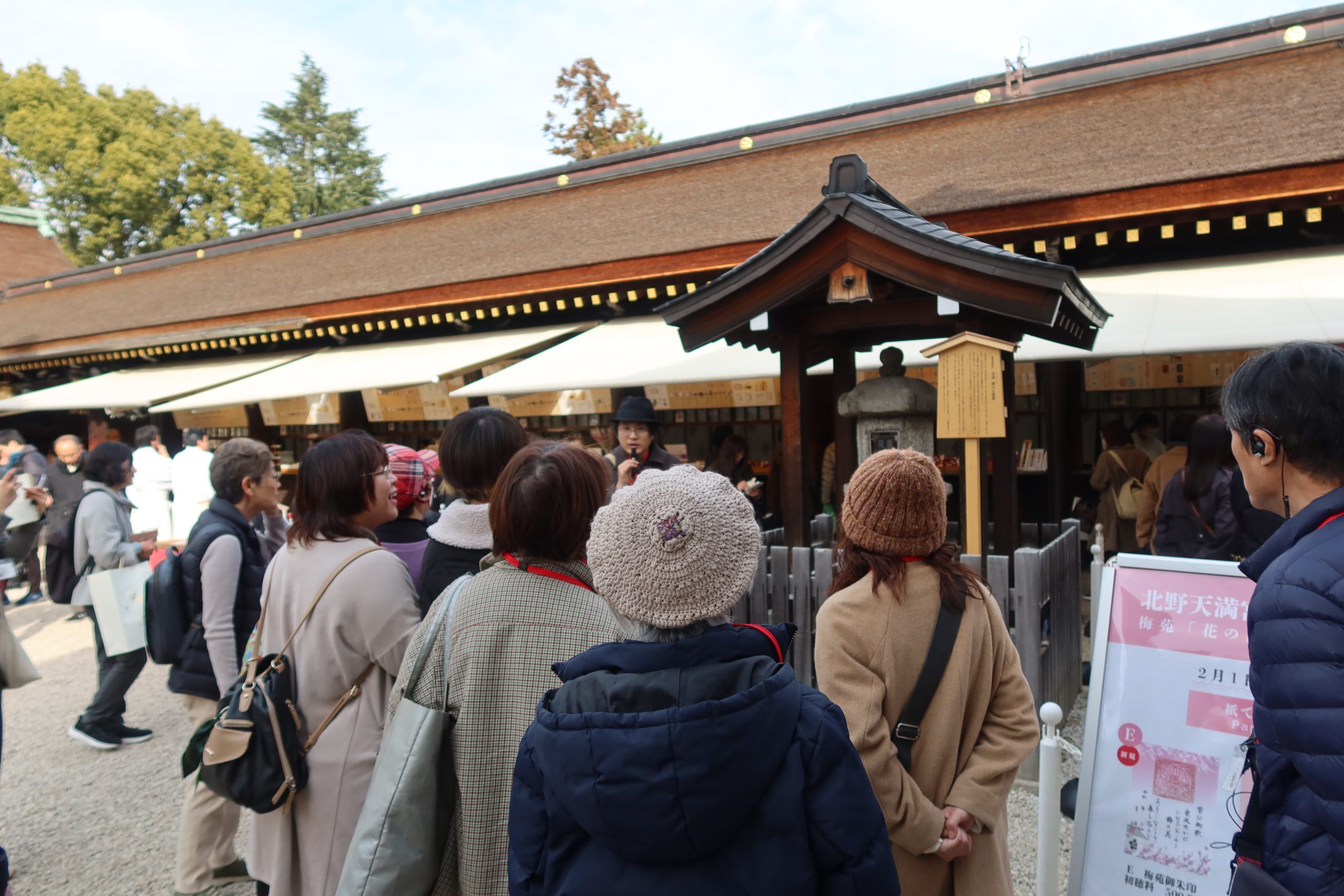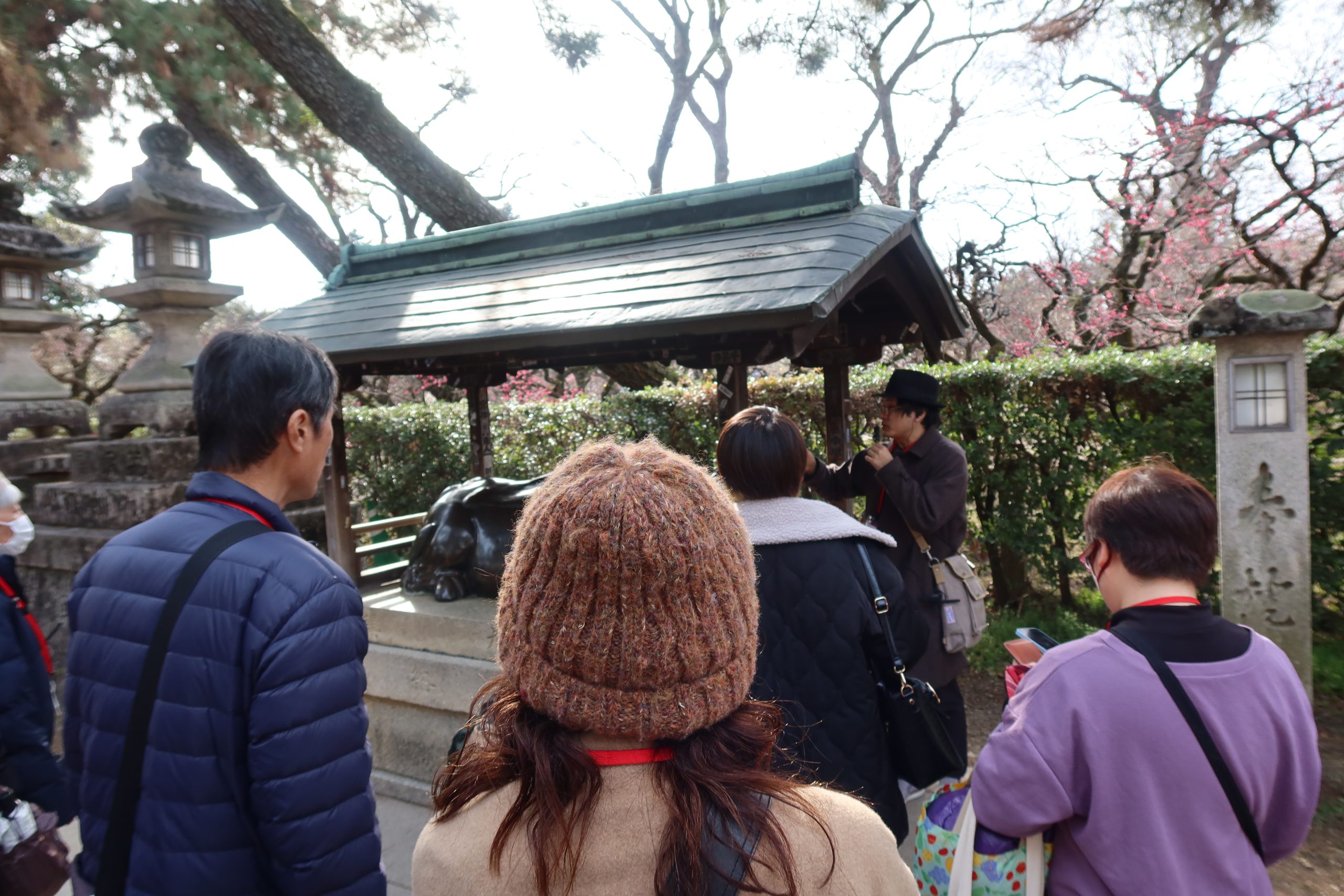 大将軍八神社から一条通りを歩き、散策の締めくくりである北野天満宮へ。一の鳥居から本殿へ向かい、渡辺綱ゆかりの石灯籠にまつわるお話を伺った後は、各自で境内を自由に散策しました。春の陽気に包まれた境内では、早咲きの梅が見頃を迎え、屋台が並ぶなど賑わっていました。