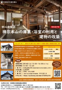 大本山妙心寺に於いて、講演と解説付き散策企画「妙心寺探訪~禅宗本山の庫裏・浴室の利用と建物の改築~」を開催いたします。