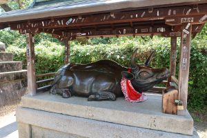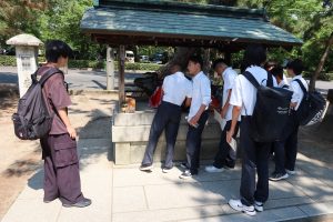 牛の像についてなど解説を踏まえながら高校生と一緒にフィールドワークを行いました。