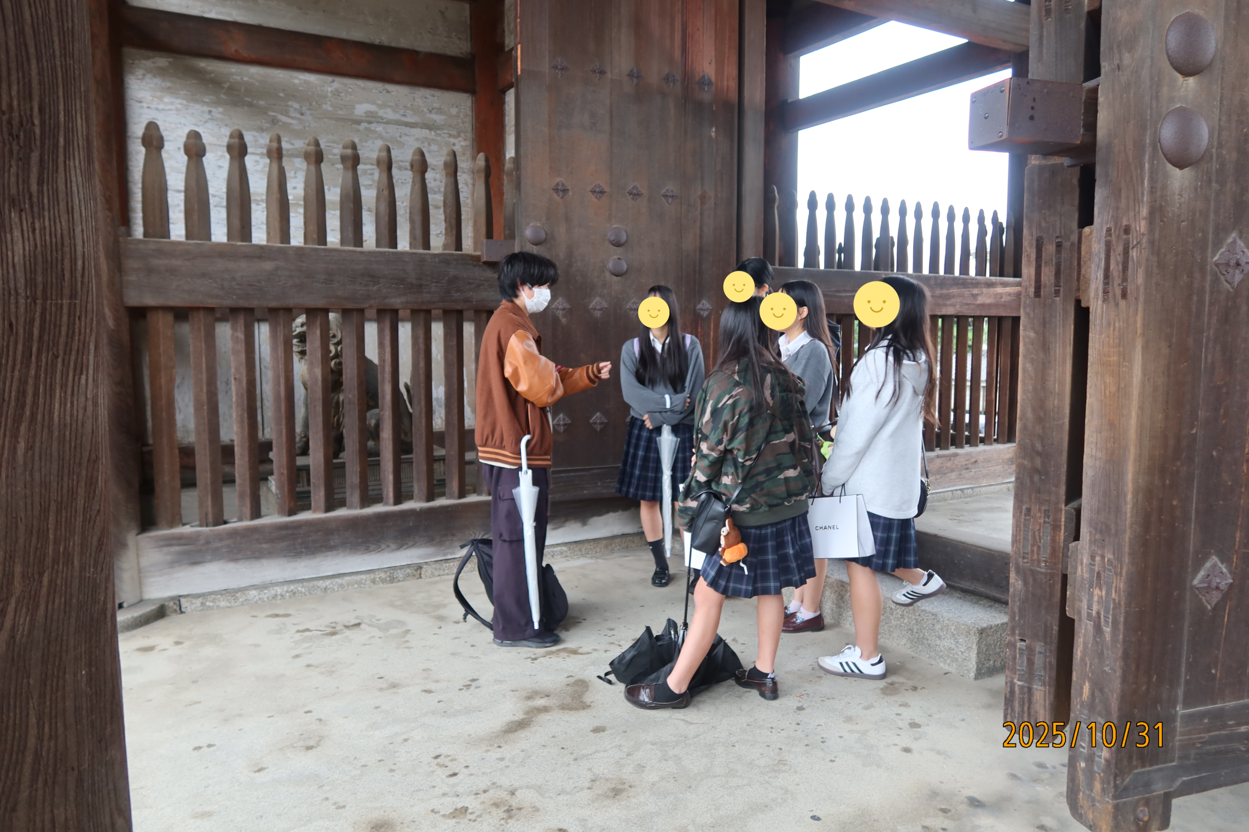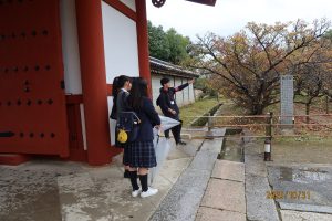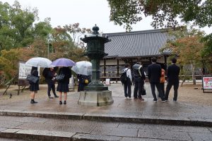 その後すぐに4グループに分かれ、各グループに学生ガイド1名が付いて二王門から中門、そして国宝・金堂、重要文化財・五重塔など