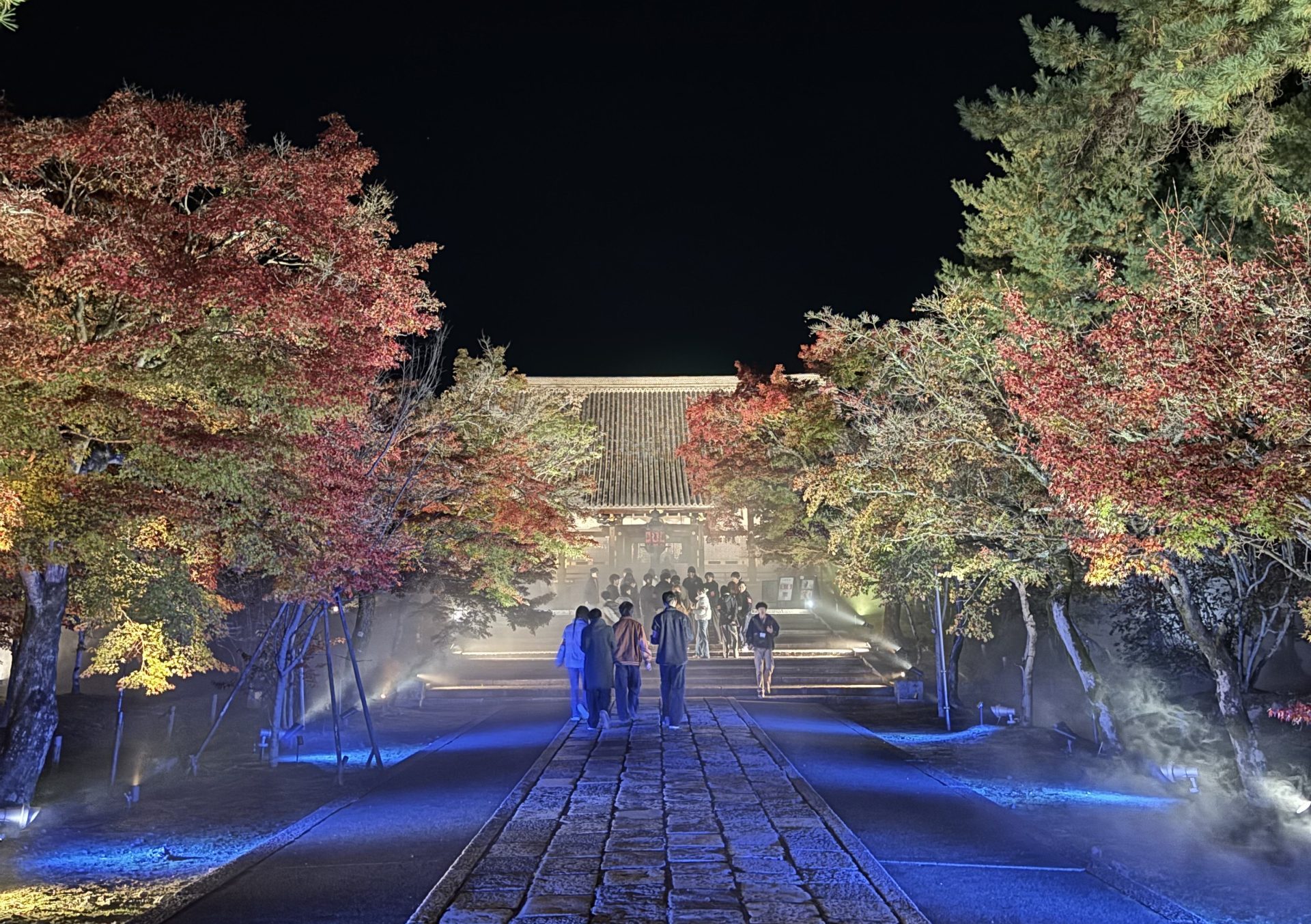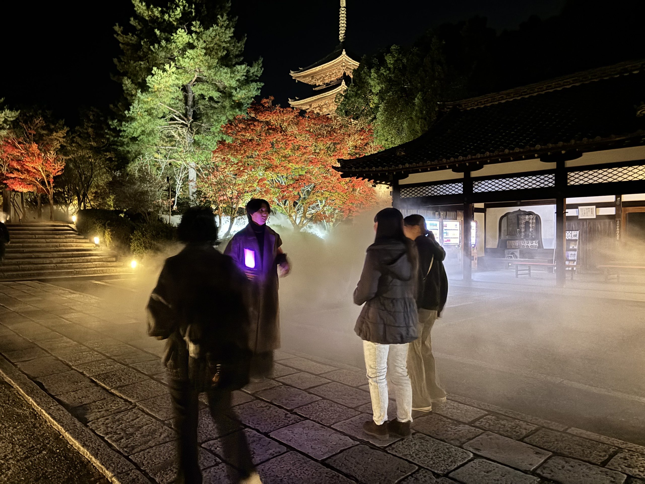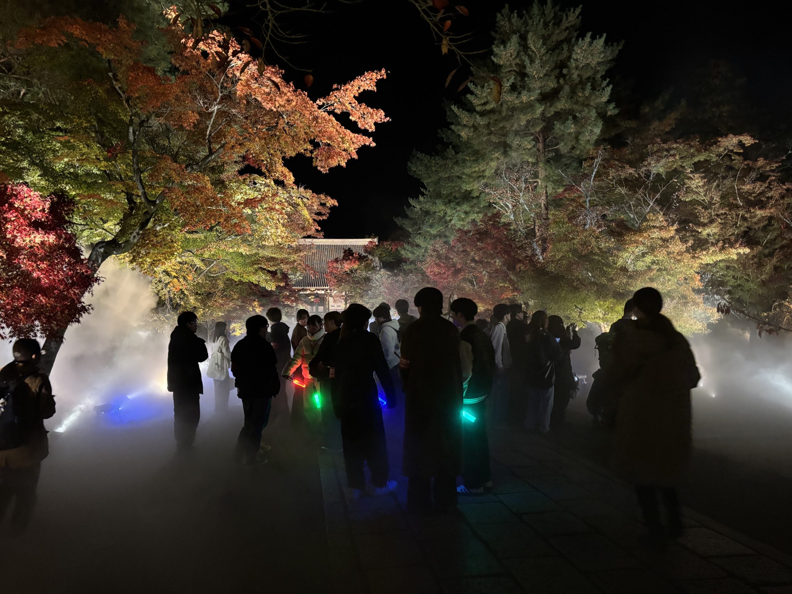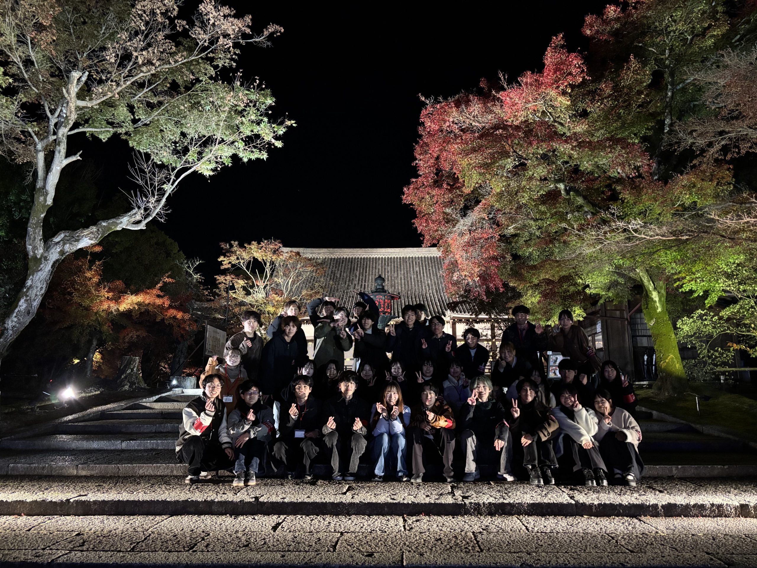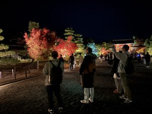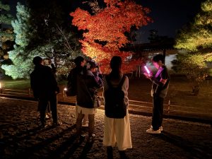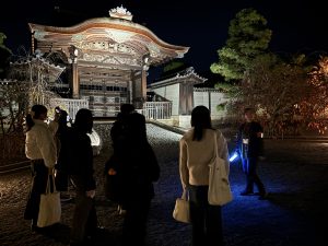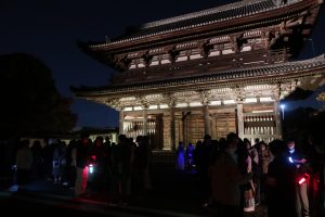 11月20日(木)に、「仁和寺 紅葉雲海ライトアップ」を開催しました。立命館大学生を対象とした本企画に、総勢188名の学生・院生が参加してくれました。参加者はまず、国の重要文化財である二王門に集まり、世界遺産 仁和寺で研修を受けた立命館大学神社仏閣ボランティアガイドの学生が仁和寺の歴史や文化を伝えながらガイドツアーを行いました。