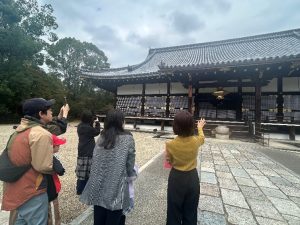 のりが乾くまでの間には立命館大学のボランティアガイドが参加者の皆さんに仁和寺の境内を案内しました。グループごとに境内を歩き、仁和寺について学びました。ガイドの方はクイズを織り交ぜながら解説を行っており、参加者の皆さんもクイズを楽しみながら解説を聞いていました。