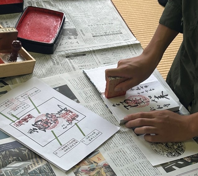 ガイドによる案内が終わって戻ってきたら、作ったご朱印帖にさっそくご朱印を押しました。今回は自分でご朱印を押すことができるということで、参加者の皆さんはお手本を見ながら、慎重に作業を行っていました。それぞれ朱肉をつけすぎてしまったり、かすれてしまったりしていましたが、これも自分で押した思い出の1つとなるでしょう。